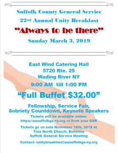 Tickets are on sale now, and can be purchased either online at our website, or in person at the monthly Suffolk County General Service Assembly.