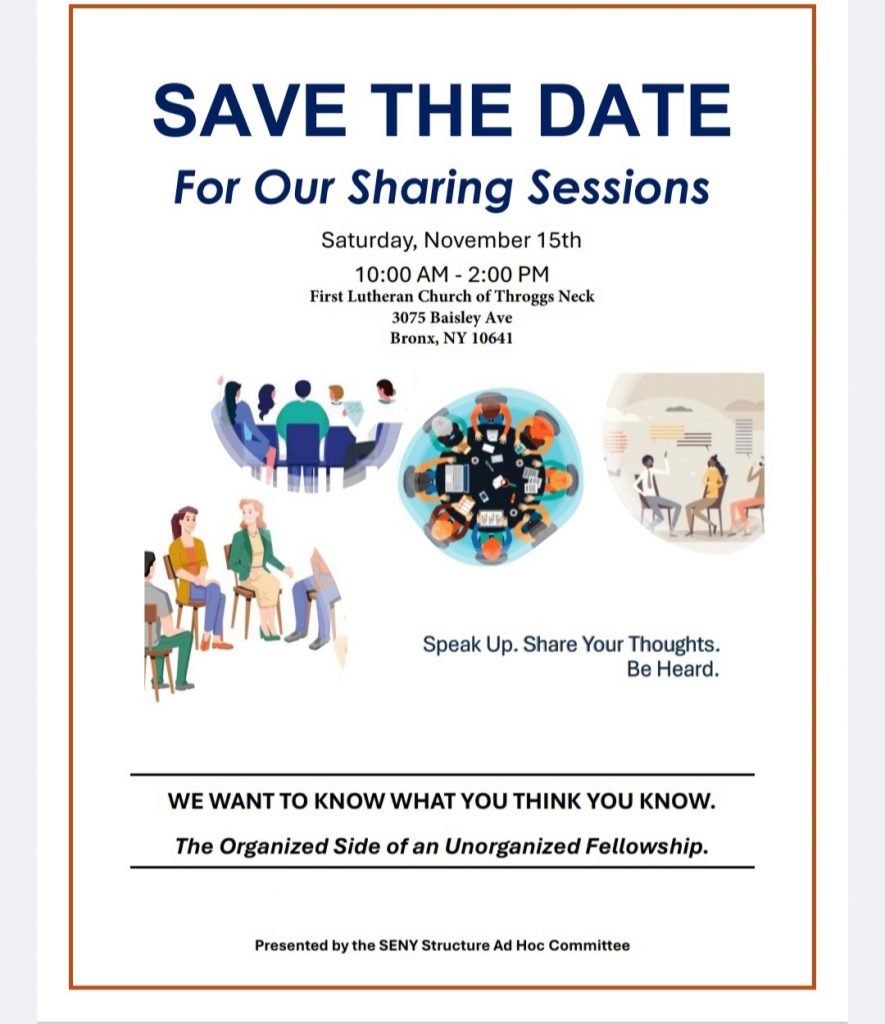 SAVE THE DATE – SENY – Sharing SessionsAugust 27, 2025Written by chair Calendar Add to Calendar Add to Timely Calendar Add to Google Add to Outlook Add to Apple Calendar Add to other calendar Export to XML When: November 15, 2025 @ 10:00 am – 2:00 pm America/New York Timezone 2025-11-15T10:00:00-05:00 2025-11-15T14:00:00-05:00 Where: First Lutheran Church of Throggs Neck 3075 Baisley Ave Bronx, NY 10461 USA